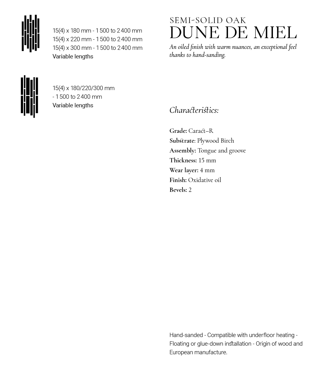 Our 'Sensorielle' collection draws inspiration from the topography of natural landscapes. Sandblasted Semi-Solid Oak Wood Parquet Flooring Dune de Miel replicates the unique contours found in these extraordinary environments through its material structure. The artisanal sanding of the oak wood delivers a symphony of tactile sensations, accentuating the wood's natural grain. The oxidized oiled finish not only enhances the wood's beauty but also provides durable protection against wear and stains. Dedicated to the quality of our creations and the origin of our materials, we ensure meticulous sourcing, prioritizing short supply chains and sustainably managed forests.