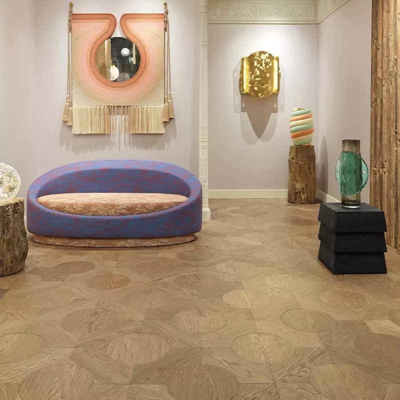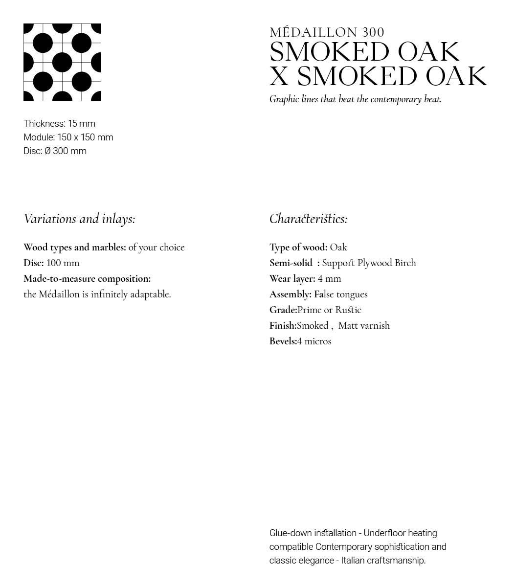 At the core of the collection is a customizable central circle, which can be adorned with a selection of woods, stones, or marble inlays. Explore the pairing of discs and Smoked Oak Wood Brown Fumé modules, designed to infuse your interiors with an atmosphere that strikes a balance between simplicity and grandeur. The 300 mm diameter disc offers the Dark Oak a unique canvas for expression, beautifully highlighting its natural grain.