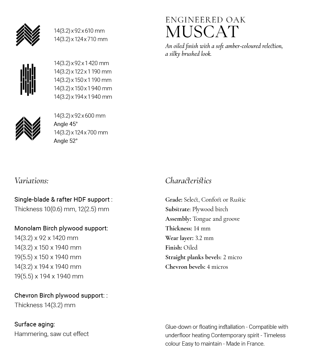 With our versatile 'à la carte' collection, you have the freedom to customize your wood flooring choose your ideal stain, wood grade, and pattern, and personalize with custom planks in various widths and lengths. Whether you prefer Chevron, Herringbone, or straight planks, our Sauvignon Engineered Oak parquet flooring provides endless possibilities from a single shade, allowing you to create a truly bespoke interior.