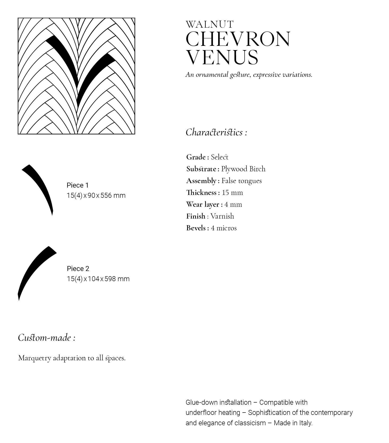 Allow yourself to be captivated by our 'Quantième' collection and Chevron Vénus in American Walnut. Vibrant and exhilarating, they bring a distinctly contemporary atmosphere to your interiors. The design, with its soft curves and bold lines, combined with its sensual, flowing patterns, creates a warm and inviting ambiance. A true reimagining of Chevron parquet, it represents a fusion of ancestral craftsmanship and visionary design. The American Walnut, with its subtle and deep tones, will infuse your spaces with warmth. Crafted in our Italian workshop, this collection is the epitome of artisanal excellence, blending innovation with creativity