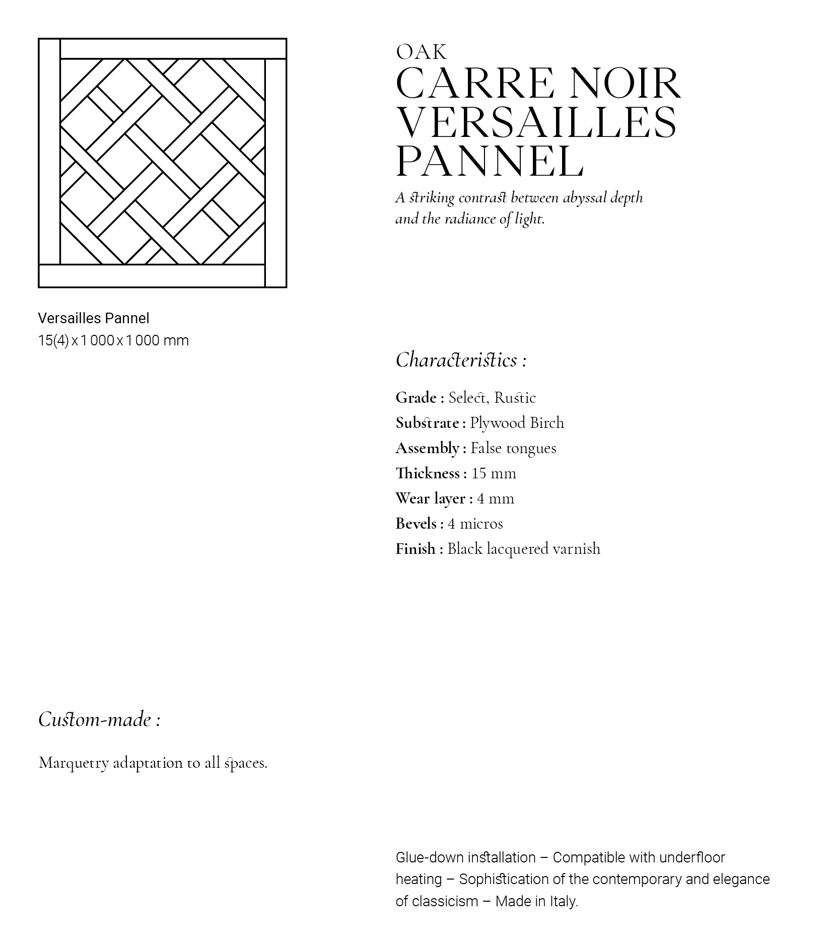 Our 'Quantième' collection and Versailles Carré Noir Wood Flooring Tile create a fascinating blend of past and present, transporting you to a timeless space. The iconic Versailles pattern, reminiscent of the grandeur of historic palaces, is brought into the contemporary era with its deep, captivating black hue. This tile perfectly marries the sophistication of modern design with the elegance of classicism. Expertly crafted by artisans, it boasts a luxuriously silky texture. The sensual curves and organic lines make it a true ode to the beauty of noble materials. Made in our Italian workshop, this collection represents the pinnacle of artisanal skill, seamlessly blending tradition with innovation and creativity