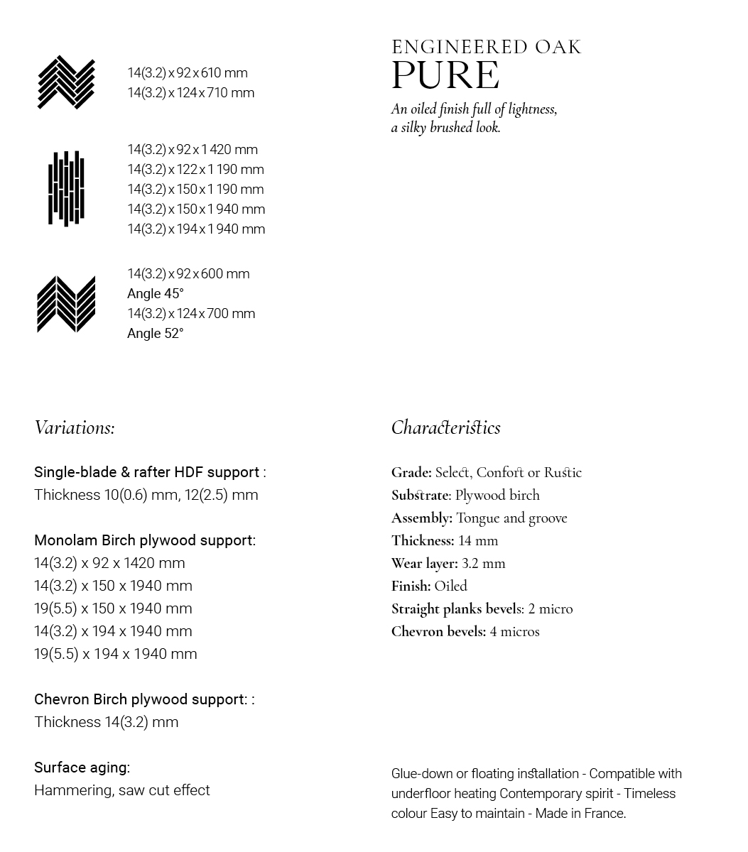Add a contemporary flair with our Pure Oak from the 'Art de Vivre' collection, featuring an oiled finish with radiant tones. The subtle brushing reveals a silky texture. With our versatile 'à la carte' collection, you have the freedom to customize your wood flooring—choose your ideal stain, wood grade, and pattern, and personalize with custom planks in various widths and lengths. Whether you prefer Chevron, Herringbone, or straight planks, our Pure Oak parquet flooring provides endless possibilities from a single shade, allowing you to create a truly bespoke interior. Dedicated to quality and sustainability, we meticulously source our materials, focusing on short supply chains and sustainably managed forests. Inspired by the rich heritage of the Bordeaux region, where our factory is located, this collection pays tribute to the birthplace of wine and the craftsmanship it represents
