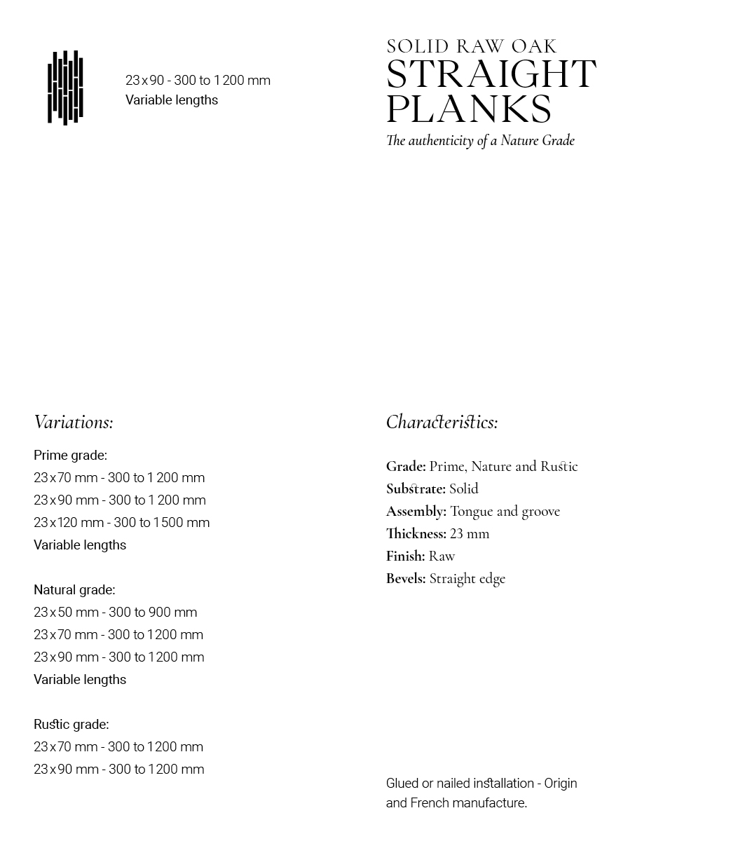 À l'État Sauvage' collection, embodied by our Unfinished Solid Oak Wood Flooring Parquet, will highlight your most ambitious renovation projects. Oils, stains, and lacquer finishes will allow the material to reveal itself and bring out its finest details. This oak flooring showcases its full authenticity. Each plank expresses its beauty through its natural grain and texture. Design your spaces with premium grade wood without bevels that can be glued or nailed down. The quality of our materials results from meticulous sourcing, combining French craftsmanship with sustainably managed forests
