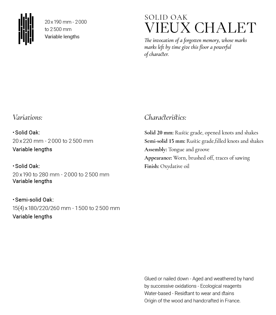 Our “Empreinte” collection and our Old Chalet Solid Oak Flooring, symbolizing the natural course of time, will offer your spaces a wealth of subtle and delicate nuances, an invitation to explore the senses and a symphony of sensations to the touch. Its veining and knots, drawing sinuous lines on the surface of the wood, will enhance your interior by giving it strength and character. Its oiled finish enhances the material while providing resistance to stains and wear. Made in our most beautiful French workshops, this floor is an ode to traditional craftsmanship. Each board bears witness to the exceptional know-how of our master craftsmen.