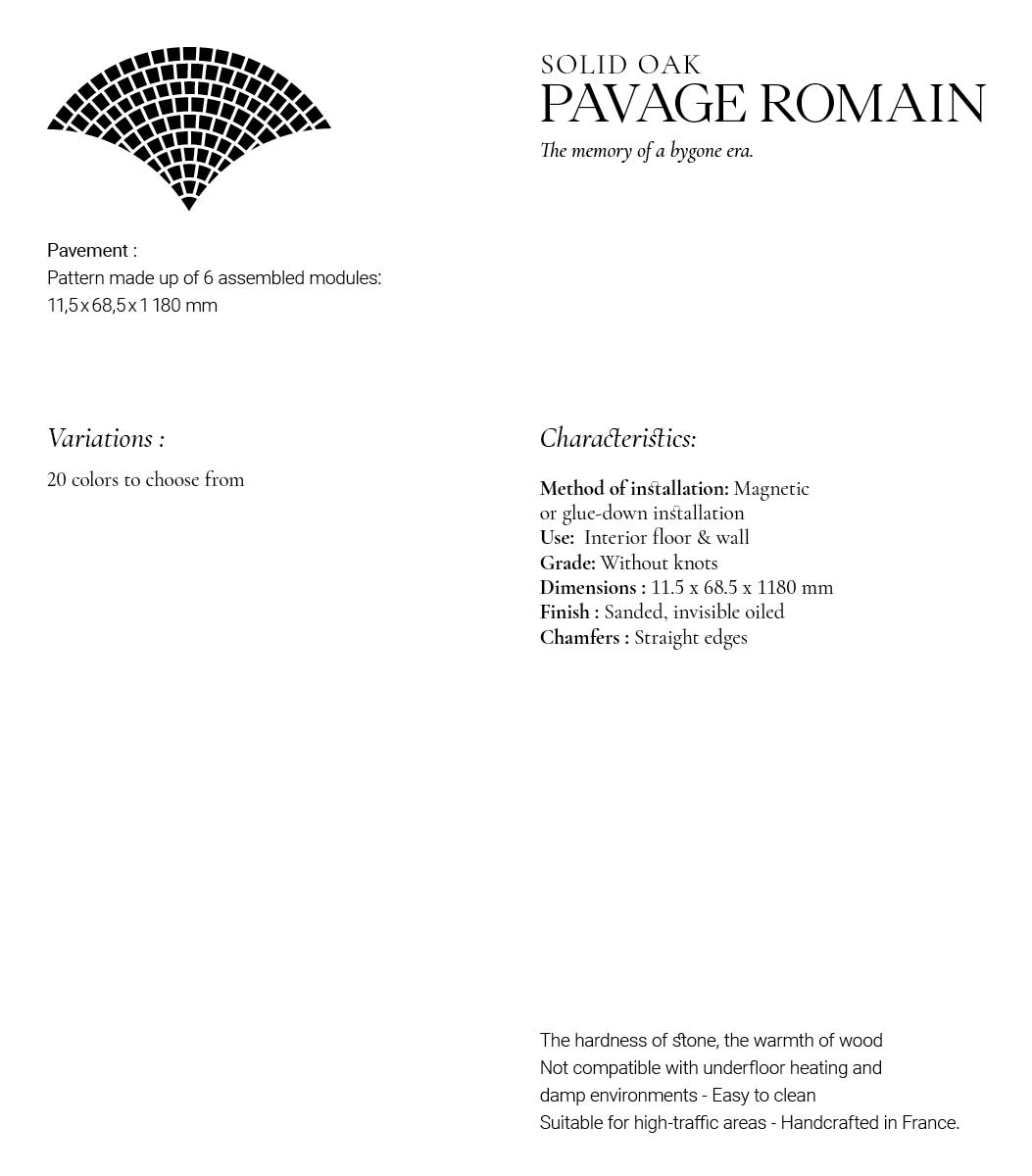 End-grain wood, rooted in a rich tradition of craftsmanship passed down through generations, has proven its enduring appeal. Once paving the streets of iconic cities like Paris, London, and New York, it eventually yielded to the spread of concrete. Our Roman Paving honors this exceptional legacy. While respecting tradition, our master artisans and French workshop have infused a contemporary rhythm into its design, faithfully capturing its distinct character. Committed to the quality of our creations and the origins of our materials, the ""Les Pavés de Paris"" collection reflects meticulous sourcing, harmonizing French craftsmanship with sustainably managed forests. In the past decade, end-grain wood has been writing a new chapter, now enhancing the walls and floors of our homes. Its innovative installation system allows for effortless application, featuring six interlocking modules that can be compressed and adhered together.