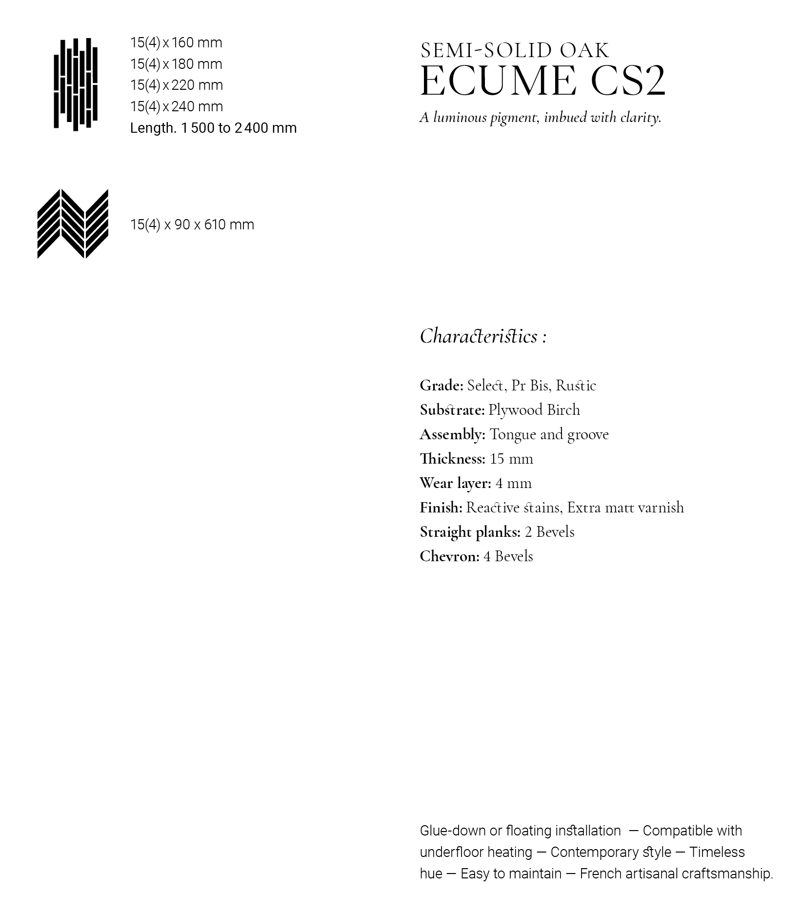 Our "Terre-Mer" collection embodies the full spectrum of emotions expressed by our terroir. Inspired by the natural richness of our surroundings, the Chevron in Semi-Solid Oak Écume CS2 captures this essence in its color. Handcrafted by our master artisans, the Écume CS2 Oak, with its pigment offering a contrast of subtle and warm tones, infuses your interiors with a deep sense of well-being. The brushing and extra-matte varnish enhance this hue while protecting the wood from wear. This artisanal creation is a heartfelt tribute to our landscapes and French craftsmanship. Dedicated to the quality of our creations and the origin of our materials, we practice rigorous sourcing, emphasizing short supply chains and sustainably managed forests.