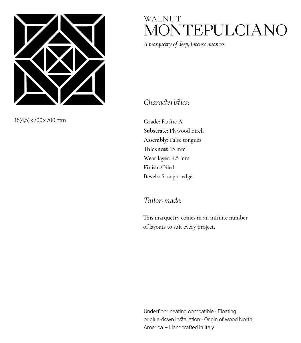 Be enchanted by our 'Imagine' collection and the Montepulciano Semi-Solid American Walnut Wood Tiles. Transforming materials into art, this collection reinterprets the timeless codes of marquetry through the exceptional skill of our Master Artisans. This panel is a homage to noble materials. Presented here in American Walnut, it is also available in Oak, Cherry, Teak, and Elm. Its striking design accentuates the material's natural nuances, grain, and texture. The deep, woodsy tones of the pigment bring a warm and intimate atmosphere to your interiors.