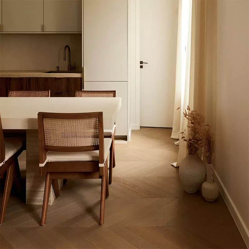 Add a contemporary flair with our Corn Oak from the 'Art de Vivre' collection, featuring an oiled finish with Light tones. The subtle brushing reveals a silky texture. With our versatile 'à la carte' collection, you have the freedom to customize your wood flooring—choose your ideal stain, wood grade, and pattern, and personalize with custom planks in various widths and lengths. Whether you prefer Chevron, Herringbone, or straight planks, our Corn Oak parquet flooring provides endless possibilities from a single shade, allowing you to create a truly bespoke interior. Dedicated to quality and sustainability, we meticulously source our materials, focusing on short supply chains and sustainably managed forests. Inspired by the rich heritage of the Bordeaux region, where our factory is located, this collection pays tribute to the birthplace of wine and the craftsmanship it represents