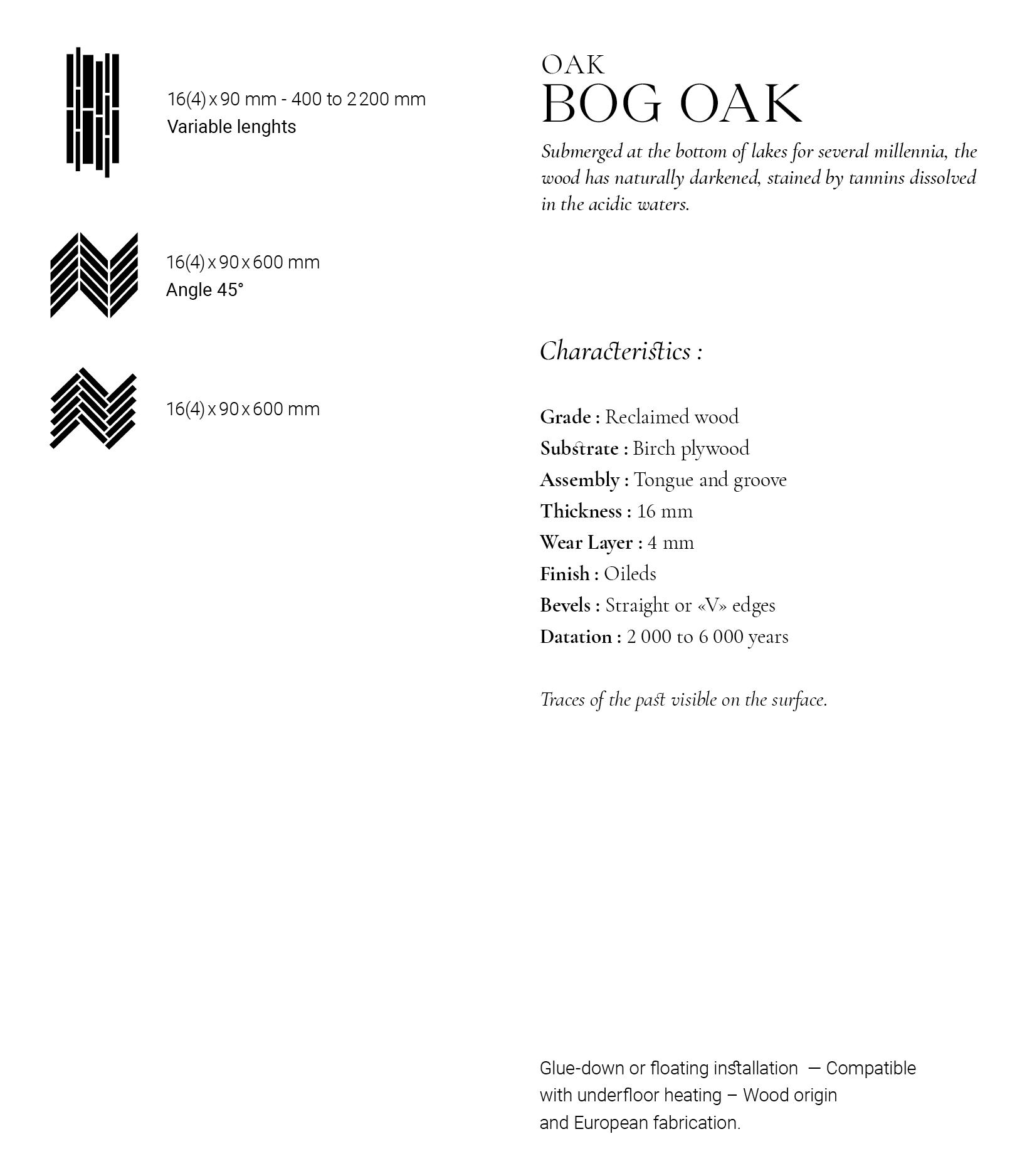 Immerse yourself in our 'Vestige' collection, where the beauty of a distant past is revived through our Herringbone Chêne des Marais Parquet flooring, crafted from semi-solid Salvaged Oak. Submerged in lakes for millennia, this wood has darkened, marked by tannins from acidic waters, resulting in a unique, richly hued character. Featuring a timeless pattern that highlights the Bog Oak’s natural beauty, with deep, subtle tones that accentuate its natural cracks and splits. A light brushing enhances the texture, while the eco-friendly, water-based invisible varnish finish preserves its authentic appeal. Dedicated to the quality of our craftsmanship and the origin of our materials, we prioritize rigorous sourcing, emphasizing short supply chains. Our approach values upcycling and the preservation of natural environments.