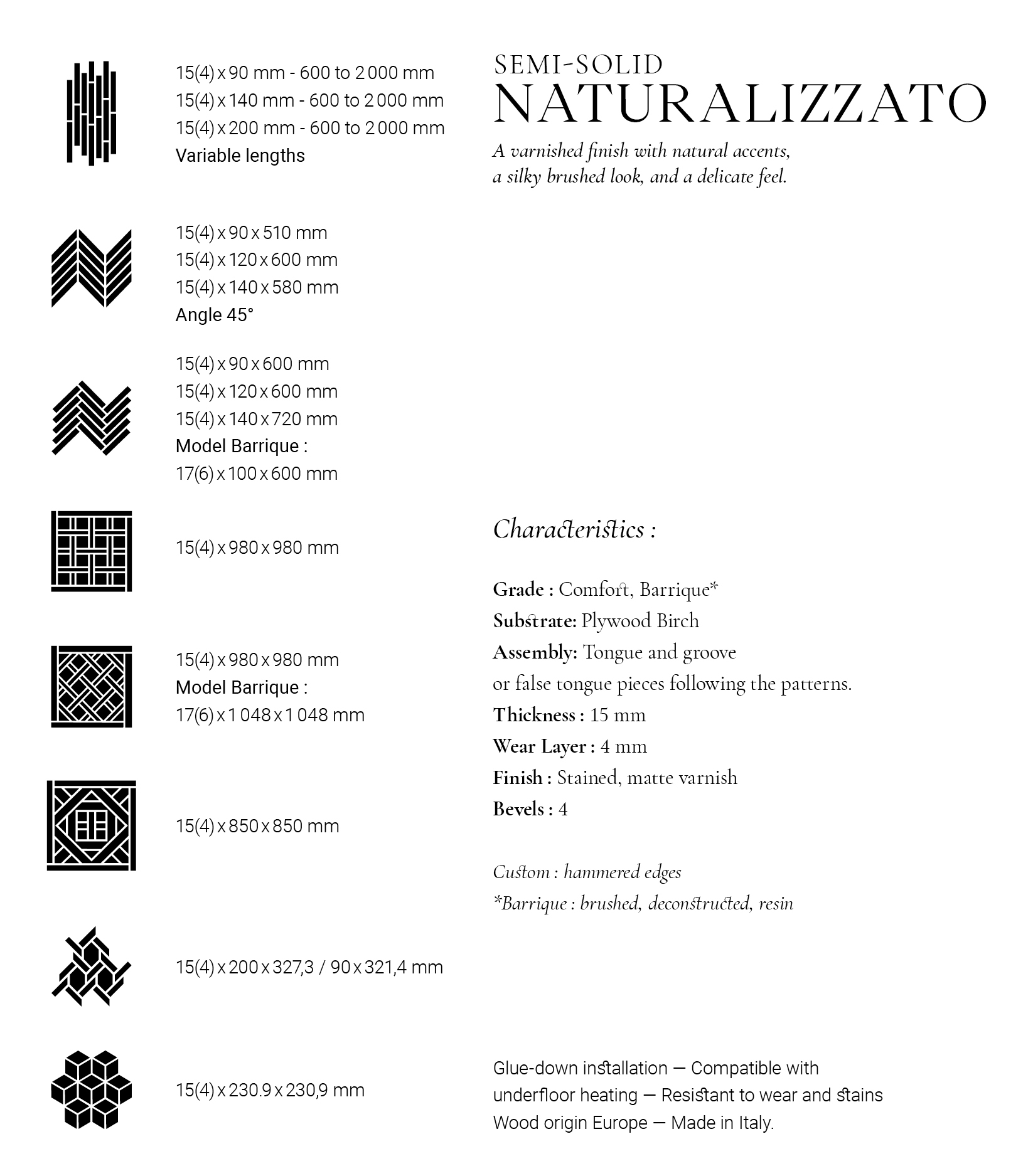 The choice of dimensions for your parquet and decking planks is of great importance. It allows you to play with the perspectives of your interiors and exteriors. While wide planks will enhance your large spaces, narrow planks will give them an unparalleled sense of grandeur.