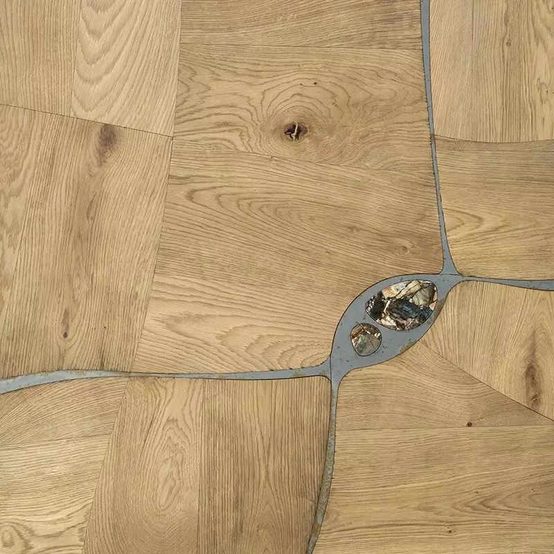 Crafted from petrified oak and shaped into flowing, organic curves, it evokes a material sculpted by time and nature, marked by an almost mineral-like movement. Each panel features a sinuous motif, accented with steel and mother-of-pearl inlays, an elegant dialogue between the density of metal and the iridescent shimmer of the ocean's depths.