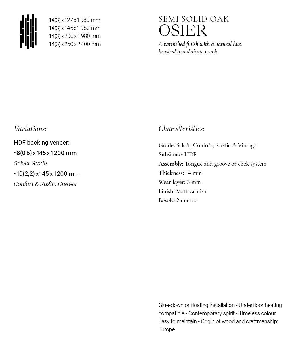 Design unique spaces with our Oak Osier Veneer. The oak, enhanced by a mineral tone, highlights the wood grain, offering an exceptional tactile experience through its delicate brushing. The varnished finish provides the material with resistance to wear and stains.