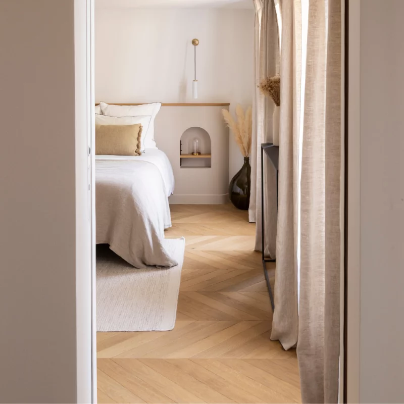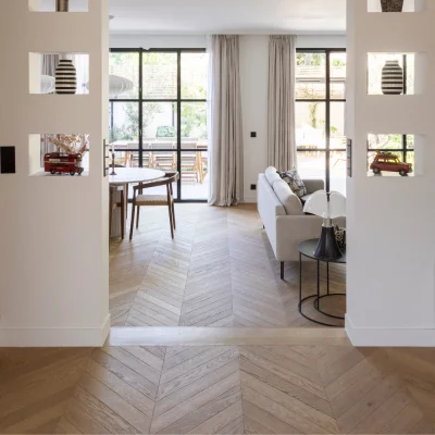Celebrate the joy of living with our 'Vénitienne' collection, crafted as an invitation to creativity and freedom. Our Semi-Solid Oak Naturalizzato Chevron Wood Flooring captures the essence of la Dolce Vita simple yet refined.