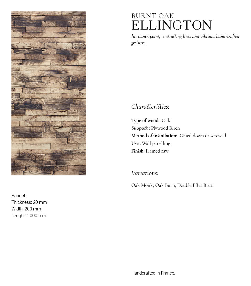 Design extraordinary spaces with our “Maître de l'Outre Noir” collection and our Ellington Oak Decorative Panel in burnt wood. The burning of the material here gives the Oak an unusual appearance, highlighting its veining and creating a play of contrasting shades. Its pattern will give your walls a unique touch imbued with relief and depth. Concerned about the quality of our creations and the origin of our species, we carry out rigorous sourcing between short circuits and sustainably managed forests.