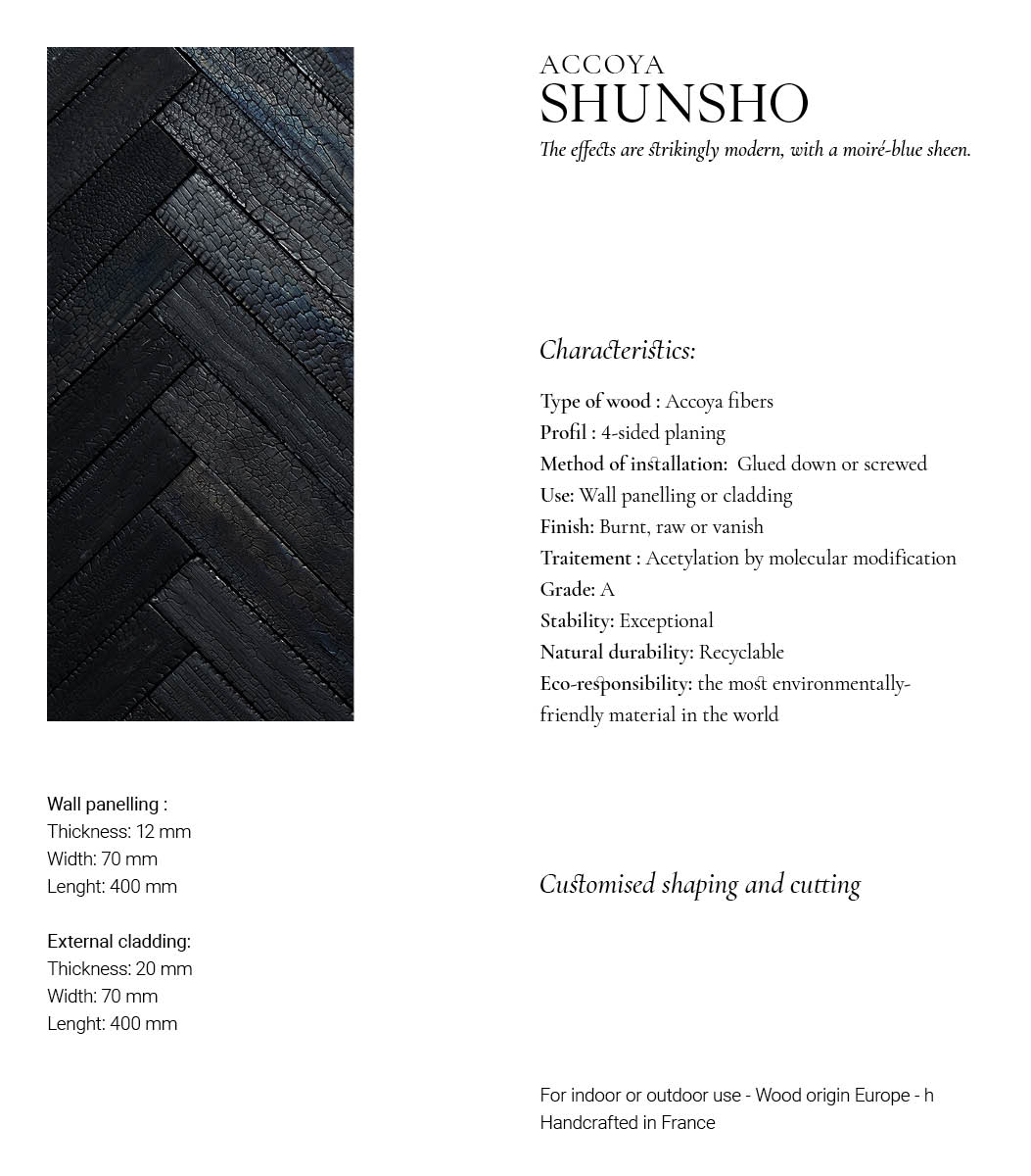 Harness the light with our "Maître de l'Outre Noir" collection and our Shunsho Accoya Decorative Panel. The use of charred wood in construction is a technique that originated in Japan, known as Shou Sugi Ban. It involves deeply charring the surface of a wooden plank to create a carbonized layer. This layer provides the wood with optimal natural protection and offers an endless range of finishes. Accoya, with its environmental and durable properties, is an ideal wood species for charred wood applications. Its unique essence imparts a distinctive aesthetic with subtle bluish tones. The charring process highlights the wood grain, creating a striking play of light and shadow. Each plank reveals its own character, rich with depth and texture. Offered here in a Herringbone pattern, it is also available in straight planks. Committed to the quality of our creations and the origin of our materials, we ensure meticulous sourcing from short supply chains and sustainably managed forests.