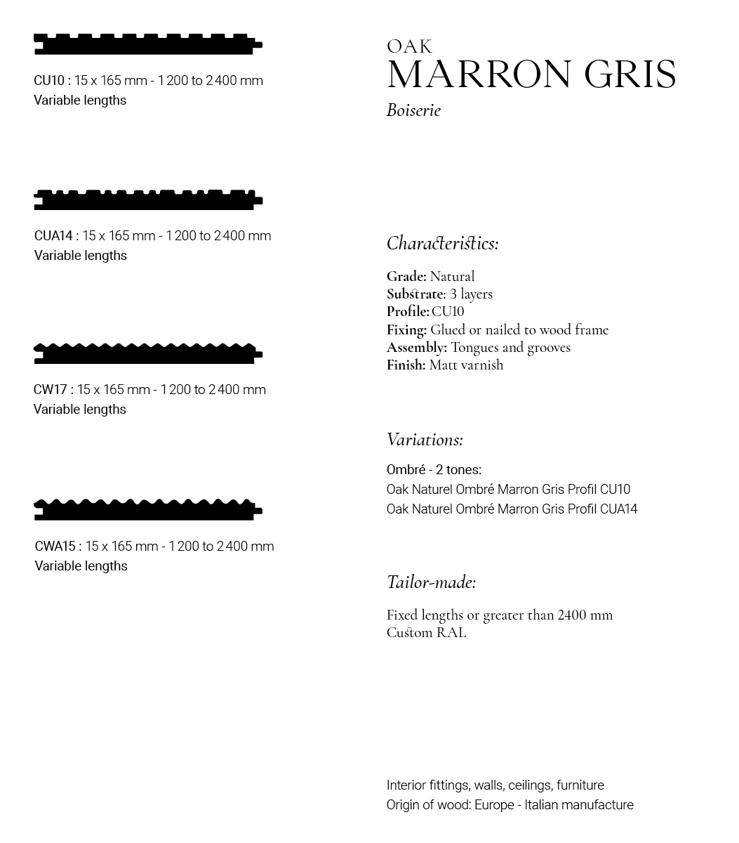 Warm up the atmosphere of your interior with our Brown Gray Oak Wall Paneling. Its deep and delicate color will give your interior a cozy atmosphere, immersed in a real play of shadows and light. Its varnished finish will provide the wood with lasting protection and a resolutely contemporary appearance. Redefine doors and walls with our “Wall Woodwork” collection: a selection of shades and profiles, offering an unrivaled spectrum of expression. Faithful to our commitment to preserving the environment and the traceability of our species, we implement rigorous selection, favoring short circuits and sustainably managed forests.