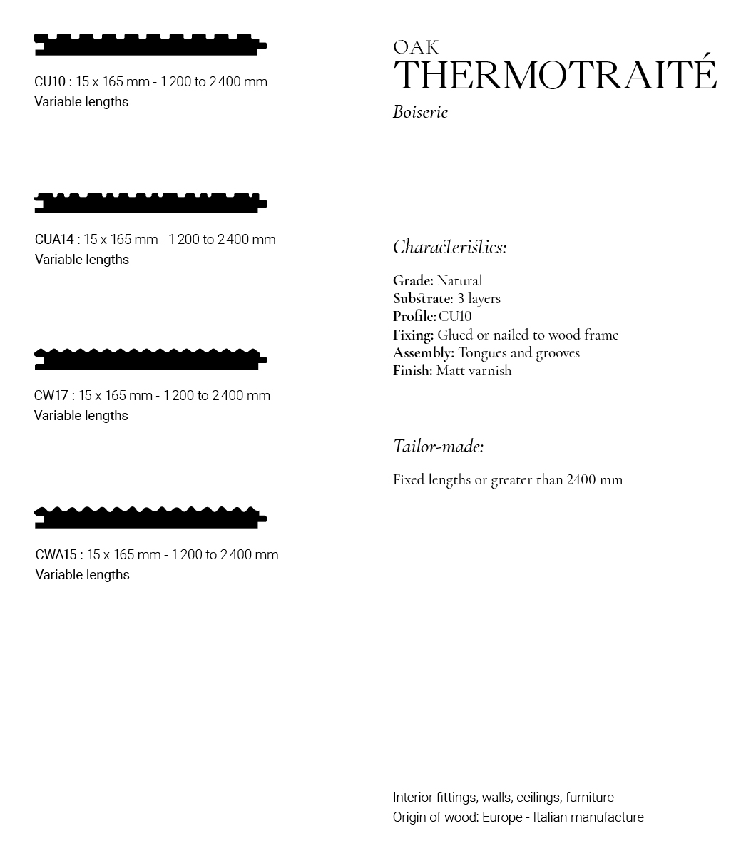 Enhance the decoration of your interior with our Varnished Heat Treated Oak Wall Paneling, with subtle and delicate nuances. Made from heat-treated European Oak, its varnish illuminates the unique grain of the wood while providing lasting protection. Redefine doors and walls with our “Wall Woodwork” collection: a selection of shades and profiles, offering an unrivaled spectrum of expression. Attentive to the preservation of the environment as well as the origin of our species, we carry out rigorous sourcing between short circuits and sustainably managed forests.