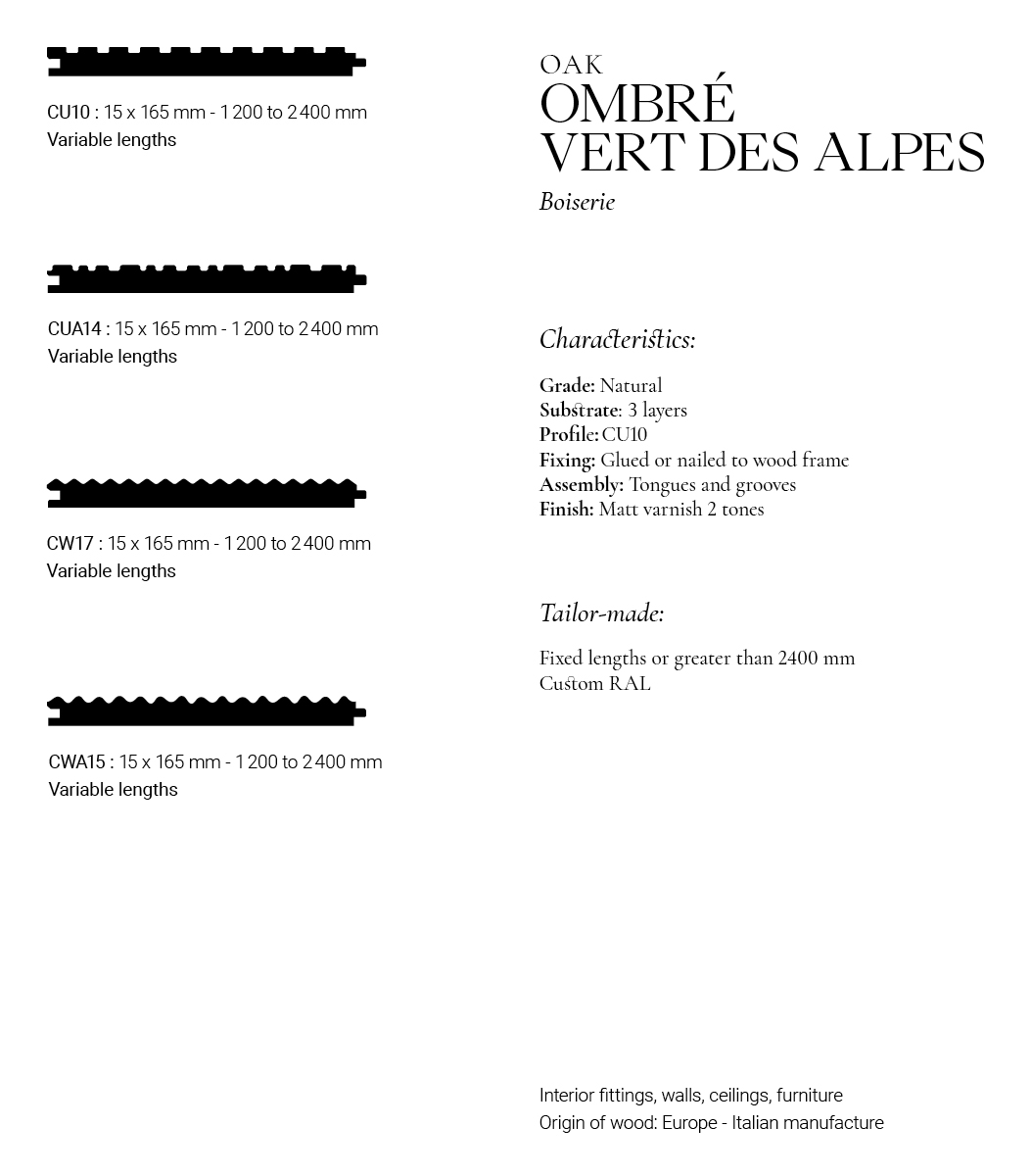Enhance the decoration of your interior with our Natural Oak Shaded Green Alps Wall Paneling. It will give a real play of shadows and lights to your spaces, giving them a subtle and contemporary atmosphere. Redefine doors and walls with our “Wall Woodwork” collection: a selection of shades and profiles, offering an unrivaled spectrum of expression. Attentive to the preservation of the environment as well as the origin of our species, we carry out rigorous sourcing between short circuits and sustainably managed forests.