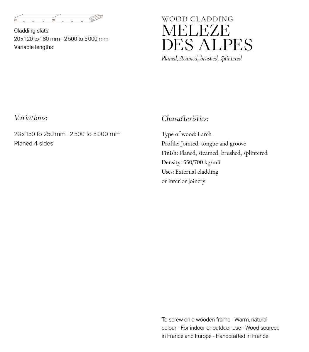 Enhance your exteriors with our Steamed Alpine Larch Cladding. It will give your spaces a richness of character and a unique warmth. Available in wall paneling, you can extend the experience in your interior. This European resinous species, particularly dense and durable, offers unparalleled weather resistance. Available in tongue and groove profile, it is also available in straight edges on request. Concerned about the origin of our species, we carry out rigorous sourcing between short circuits and sustainably managed forests.