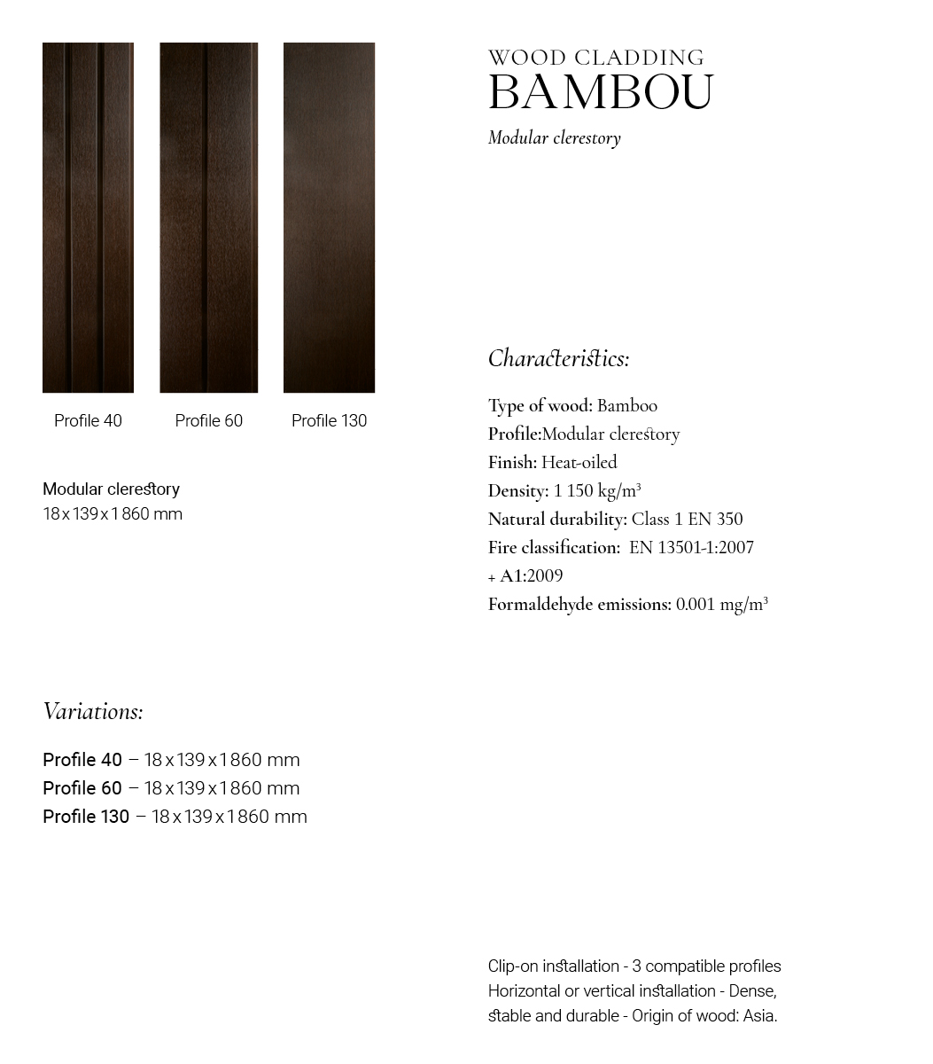The uniqueness of our Bamboo Cladding lies in the range of combinations it offers. Its three compatible models offer the possibility of uniform or cadenced installation, in horizontal or vertical orientation. Made from heat-treated bamboo, it maximizes the benefits of this abundant and fast-growing tree. This material is obtained by exposing bamboo fibers to extremely high temperatures (200°C) to preserve them against mold and fungi, before compressing them at high pressure in combination with a phenolic resin. The final product is an exceptionally stable and resistant material, ideal for exterior cladding application. The Bamboo Cladding slats are available with a matt oiled finish. They are fixed using completely concealed stainless steel clips.