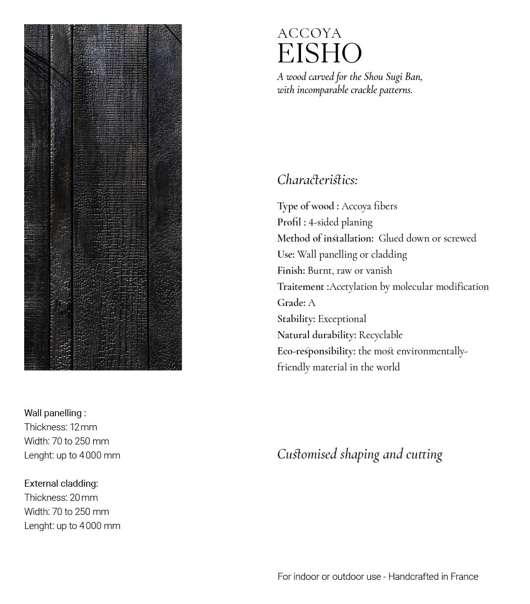 Harness the light with our "L'Outrenoir" collection and our Eisho Accoya Decorative Panel. The use of charred wood in construction is a technique that originated in Japan, known as Shou Sugi Ban. It involves deeply charring the surface of a wooden plank to create a carbonized layer. This layer provides the wood with optimal natural protection and offers an endless range of finishes. Accoya, with its environmental and durable properties, is an ideal wood species for charred wood applications. Its unique essence imparts a distinctive aesthetic with subtle bluish tones. The charring process highlights the wood grain, creating a striking play of light and shadow. Each plank reveals its own character, rich with depth and texture. Offered here as straight planks, it is also available in herringbone pattern. Committed to the quality of our creations and the origin of our materials, we ensure meticulous sourcing from short supply chains and sustainably managed forests.