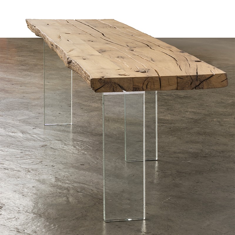 Façonné à partir de Chêne antique, ce plateau de table en bois massif arbore une finition vernie qui met en valeur les veines profondes de la matière.