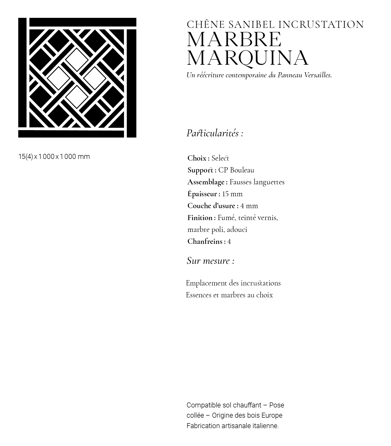 • Dalles de Versailles Chene Sanibel incrustation Marbre Marquina - 15x980x980 - choix confort - produits entretien - carresol