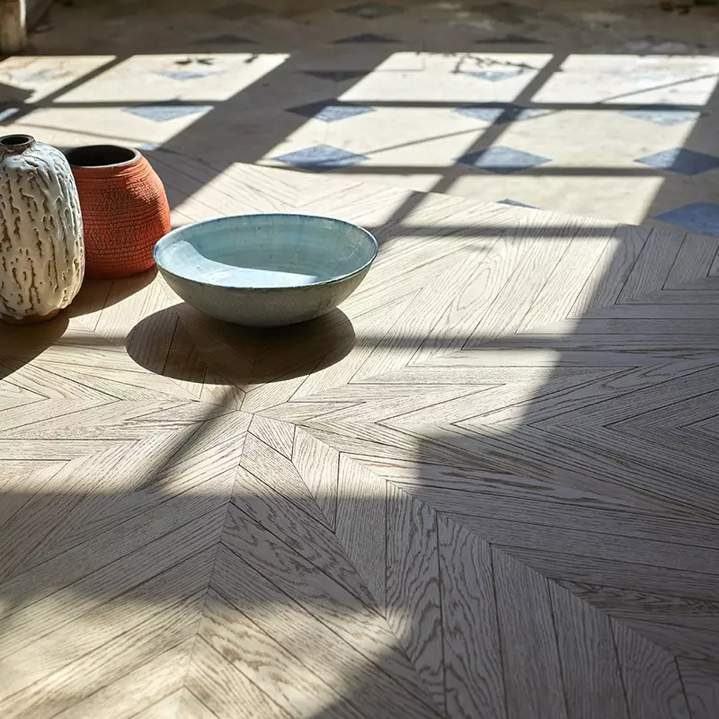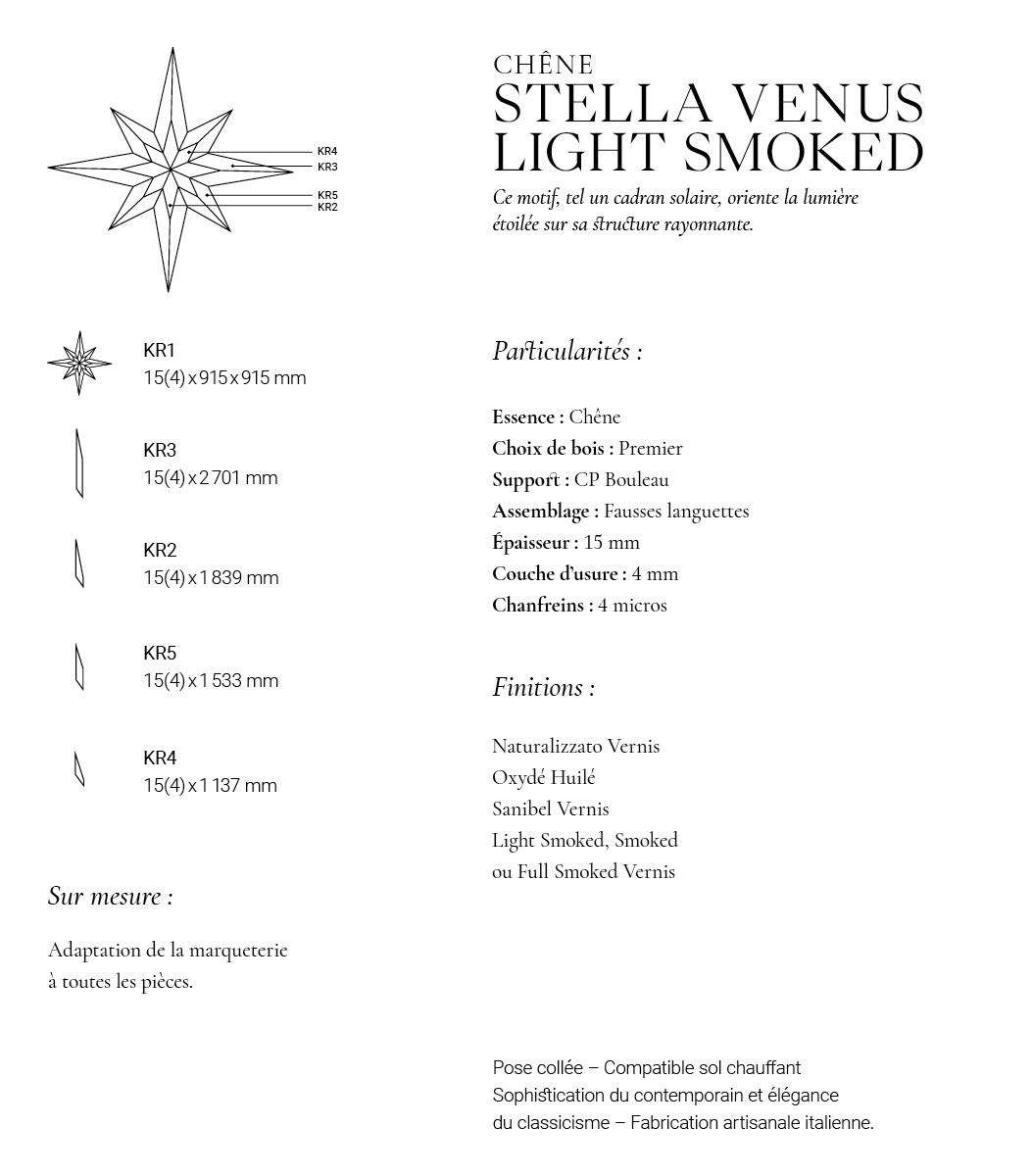 Our 'Quantième' collection and Stella Vénus Light Smoked parquet embody the fusion of ancestral craftsmanship with a visionary spirit. Inspired by constellations, its unique pattern evokes the shape of a star. The dynamic, bold lines bring an extraordinary perspective to your interiors. The subtly smoked finish gives the oak a soft and warm appearance. Crafted in our Italian workshop, this collection is the epitome of artisanal excellence, blending innovation with creativity