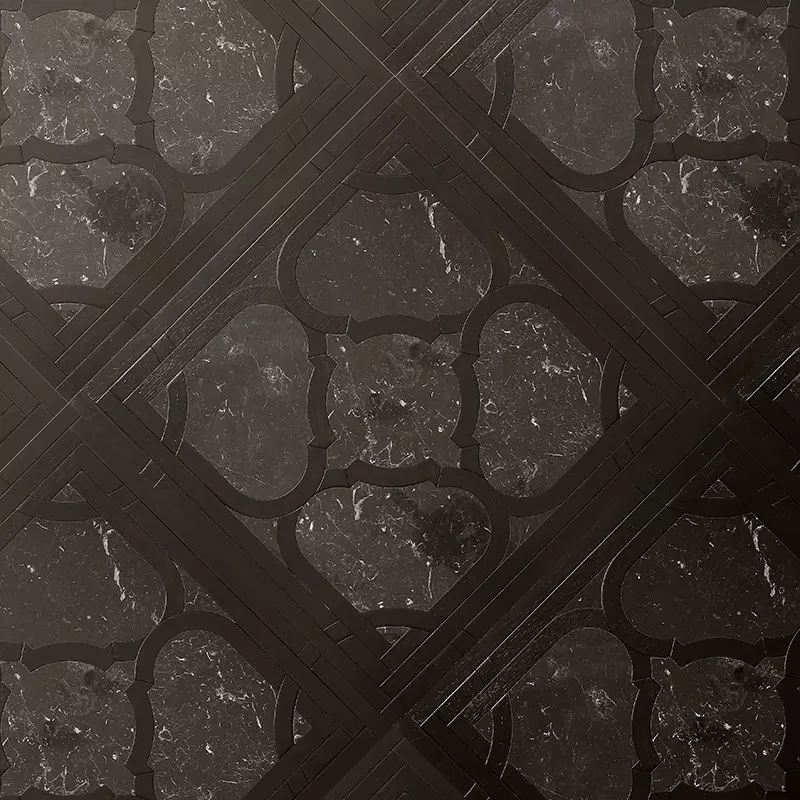 Réinterprétant les codes classiques de la marqueterie, celle-ci s’inscrit dans une tonalité contemporaine. Le Noir s’exprime dans toute sa splendeur à travers la profondeur du chêne et les variations de nuances offertes par le marbre.