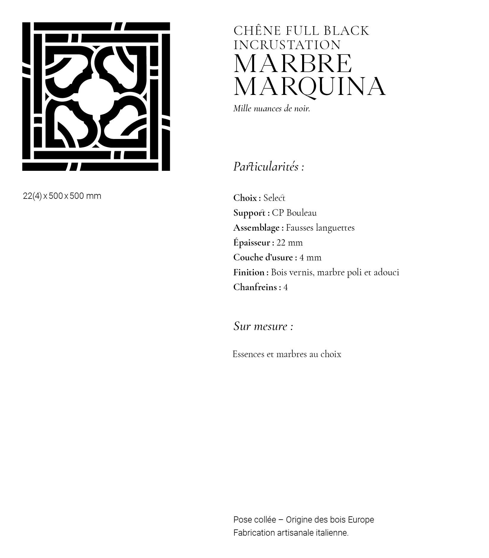 Laissez libre cours à votre imagination et dessinez des espaces uniques avec notre collection « Quantième » pensée comme un écrin, un refuge idéal aux rêves les plus extravagants, à l’image de notre Dalle Marqueterie Chêne Full Black incrustation Marbre Marquina.