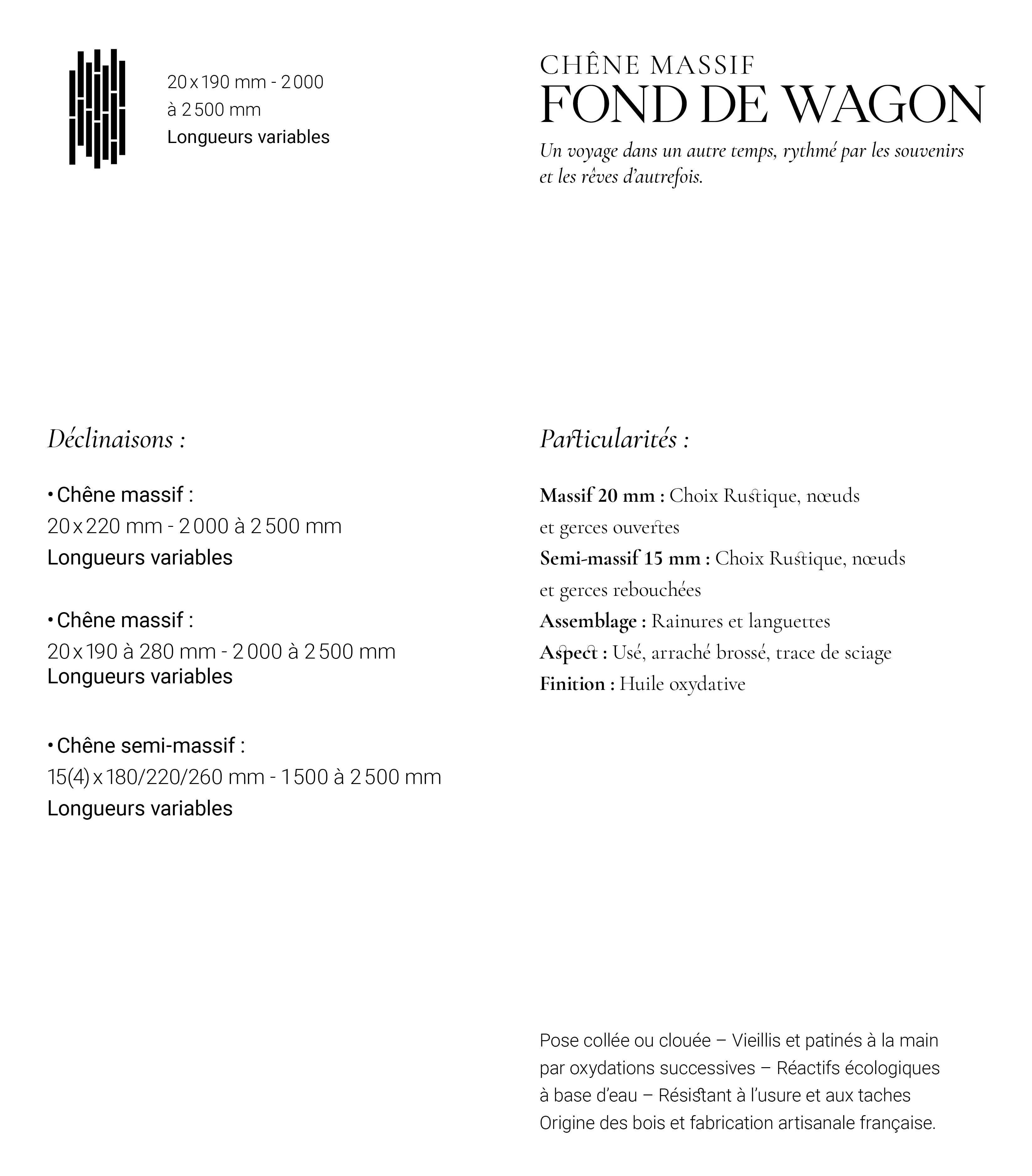Telle une ode à la matière, notre Plancher en Chêne Massif Fond de Wagon et notre collection « Empreinte » révèlent les plus infimes détails du bois tout en mettant en lumière ses lignes sinueuses.