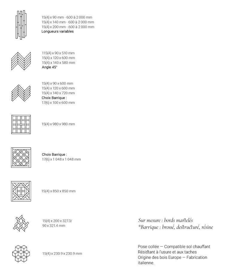 The choice of dimensions for your parquet and decking planks is of great importance. It allows you to play with the perspectives of your interiors and exteriors. While wide planks will enhance your large spaces, narrow planks will give them an unparalleled sense of grandeur.