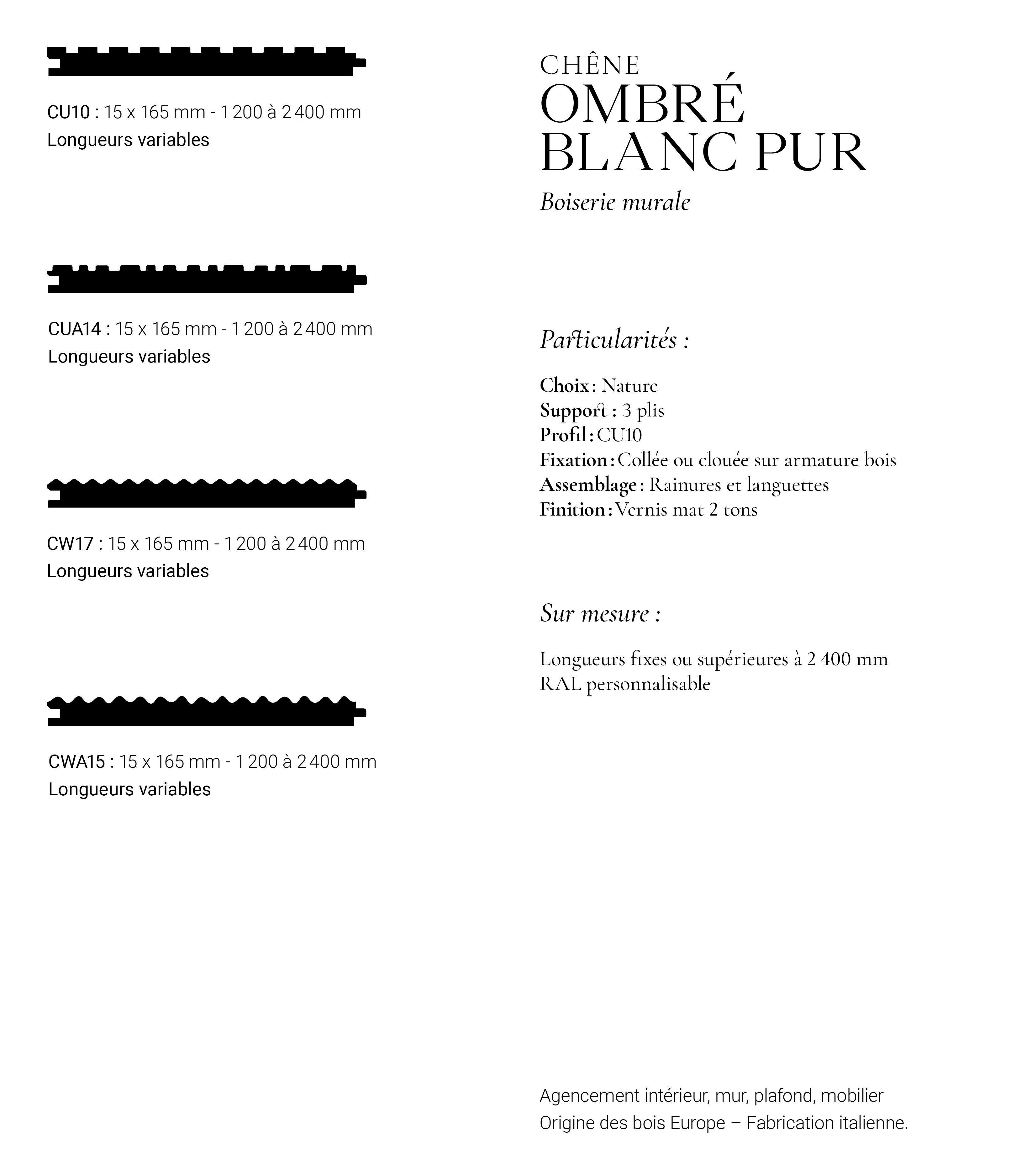 Brighten up your interiors with our Pure White Shaded Natural Oak Wall Paneling. Made from European Oak, it will offer your decoration a delicate and warm atmosphere. Its varnish will give the wood lasting protection. Redefine doors and walls with our “Wall Woodwork” collection: a selection of shades and profiles, offering an unrivaled spectrum of expression. Attentive to the preservation of the environment as well as the origin of our species, we carry out rigorous sourcing between short circuits and sustainably managed forests.