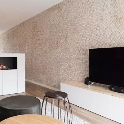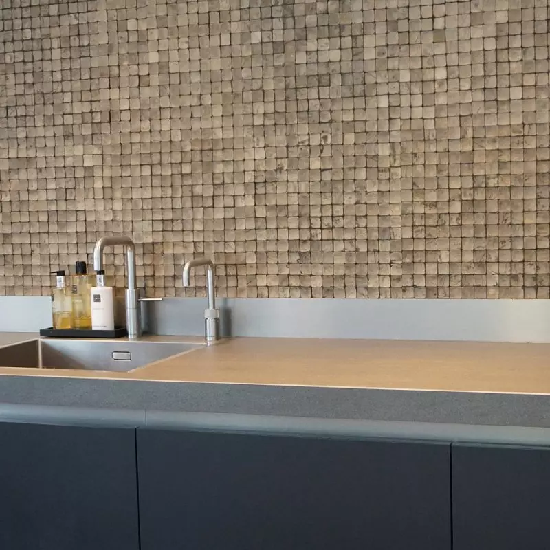 Discover the distinctive allure of our White-Tinted Acacia Decorative Panel. Expertly crafted from recycled acacia, this wall covering brings an Art Deco touch to your interior with its mosaic patterns in mineral tones. Its mesh-backed design makes installation effortless, allowing you to easily enhance any wall in your home. Transform your living spaces into warm, inviting environments. This panel is also well-suited for humid areas. Produced with environmental respect, it is made entirely from recycled materials.